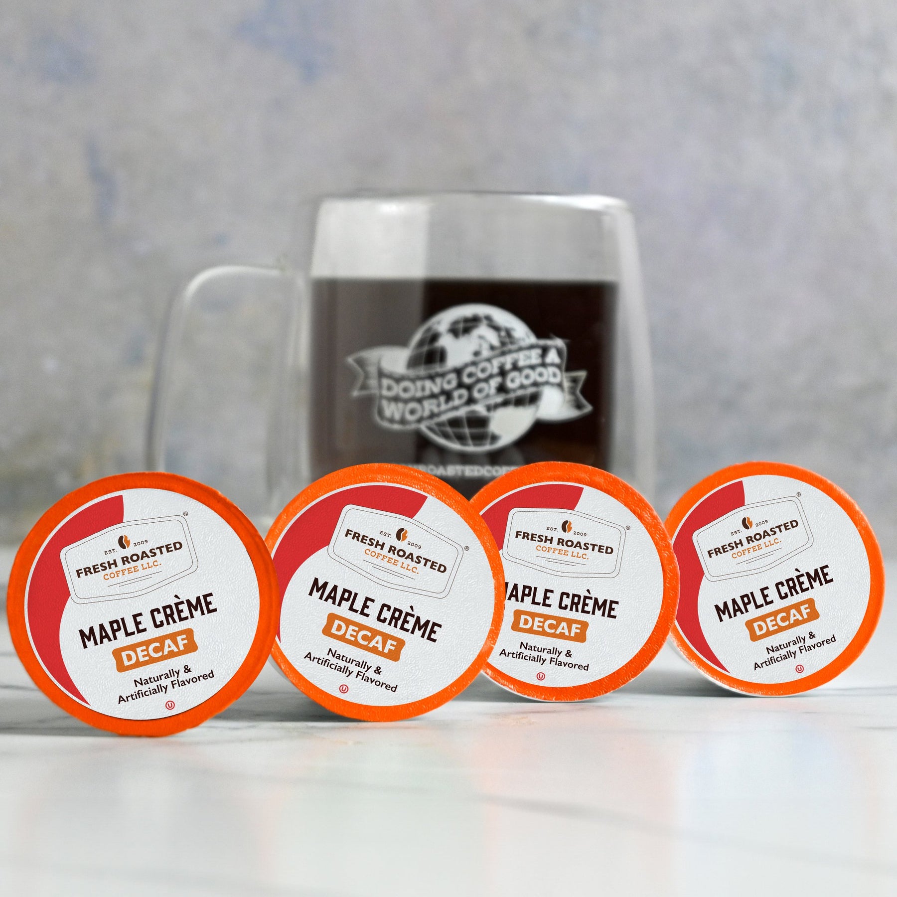 Your favorite Fresh Roasted Coffee flavors now without the caffeine - introducing Decaf Flavored Coffee! Each pod is filled with Fresh Roasted Coffee and Maple Crème flavor - nothing else. Every variety is sugar-free- plus 99.9% of the caffeine has been removed using a water-based decaffeination process. And just like our regular coffee, each pod is nitrogen-flushed to maximize freshness.