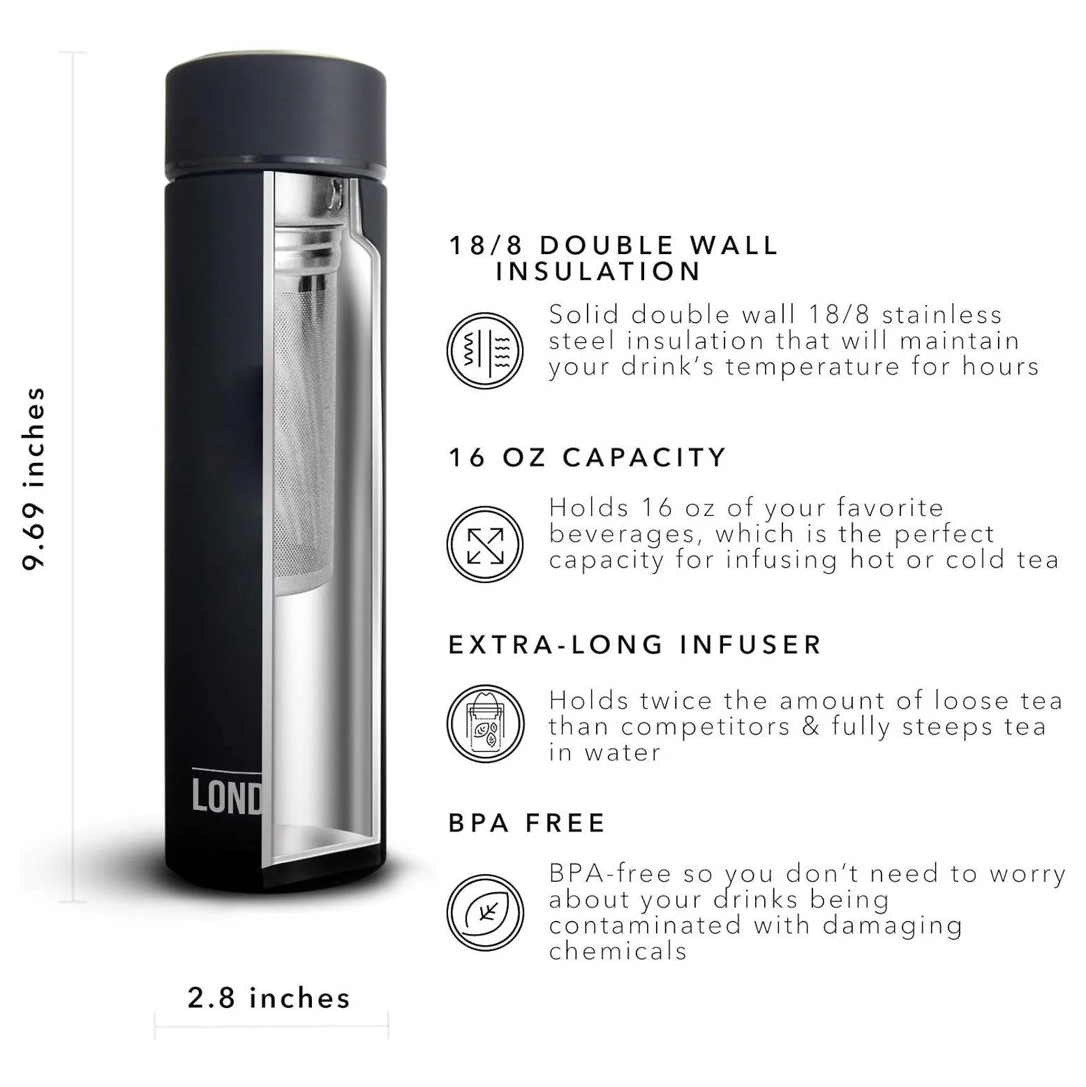 The 16oz capacity is the perfect grab and go size, easily fitting into a carry bag, back pack, or the cup holder of your car while the gasket sealed lid prevents leaks and spills. Available in Black or Lilac, the London Sip Tea Infuser bottle is a must have for your daily routine.