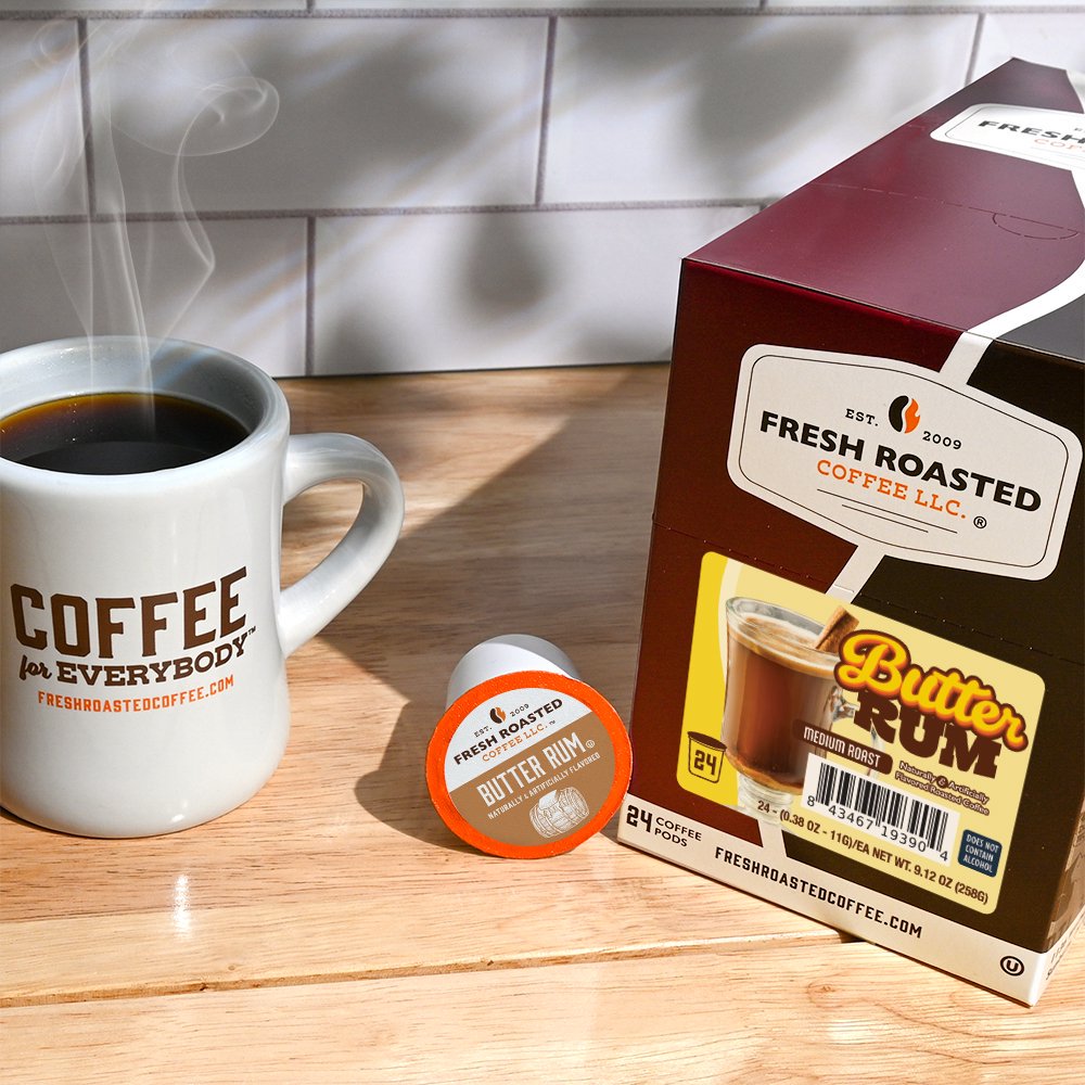 We've taken FRC to the next level of flavor - it's Fresh Roasted Flavored Coffee Pods! Each pod is packed with Fresh Roasted Coffee and our own butter rum flavor - no sugar, no artifical sweeteners. And just like our traditional coffee pods, each one is nitrogen-flushed to maximize freshness. Flavored using natural & artificial flavors.