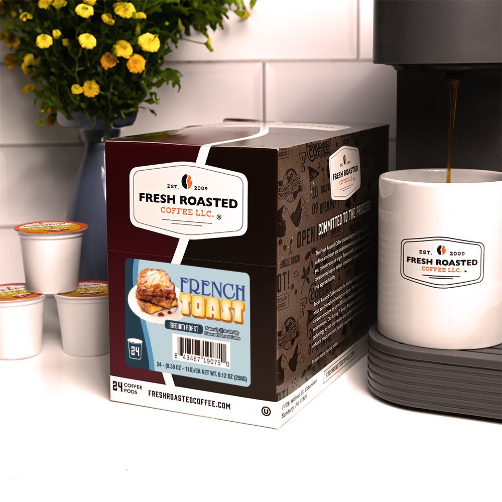 We've taken FRC to the next level of flavor - it's Fresh Roasted Flavored Coffee Pods! Each pod is packed with Fresh Roasted Coffee and our own French toast flavor - no sugar, no artifical sweeteners. And just like our traditional coffee pods, each one is nitrogen-flushed to maximize freshness. Flavored using natural & artificial flavors.