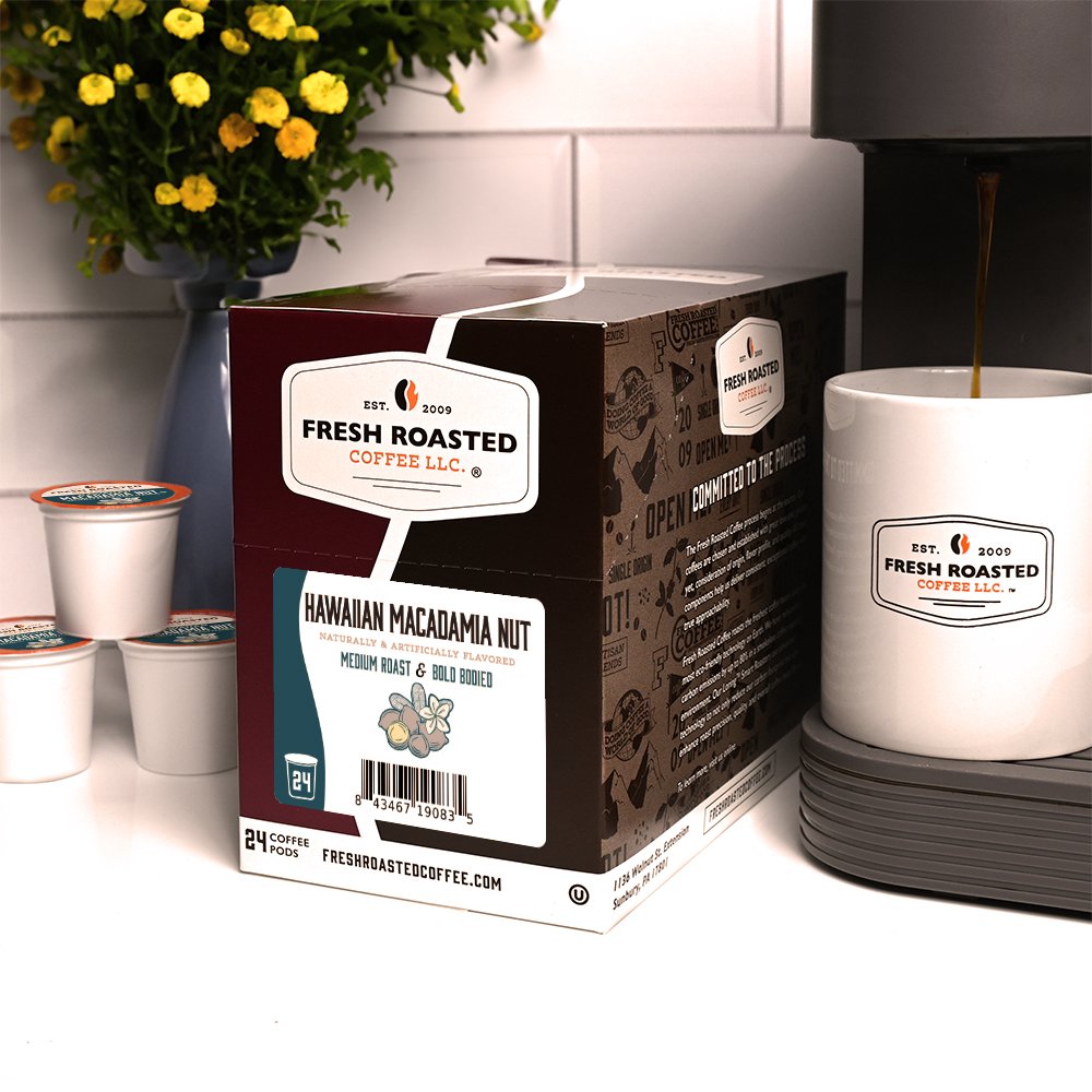 We've taken FRC to the next level of flavor - it's Fresh Roasted Flavored Coffee Pods! Each pod is packed with Fresh Roasted Coffee and our own macadamia nut flavor - no sugar, no artifical sweeteners. And just like our traditional coffee pods, each one is nitrogen-flushed to maximize freshness. Flavored using natural & artificial flavors.