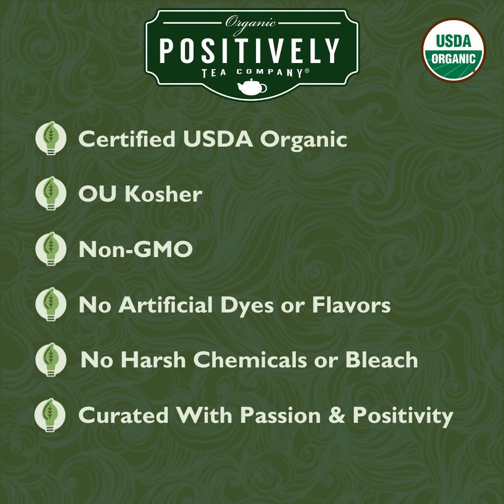Here at Positively Tea, we’re curating the world’s most positive tea experience. We believe that high-quality tea products promote overall health and well-being. Tea is meant to be enjoyed, and the process, brewing either loose-leaf or bagged tea, should be as health-conscious as possible. We’re proud to offer exclusively bleach and glue-free tea bags so that every Positively Tea customer can enjoy the natural flavors and benefits without the use of toxic glues and chemicals. Our entire product line is USDA certified organic and sourced with the utmost care so you always arrive at an outstanding cup of tea.